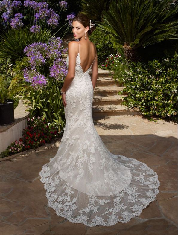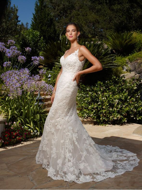 Beaded lace appliqués on Point D’esprit over Luxe Satin gown. Beaded lace appliqué is accented with Swarovski Crystals, pearls, beads and silver backed sequins. “V” shaped neckline with pearl encrusted spaghetti straps with a fit and flare silhouette.
