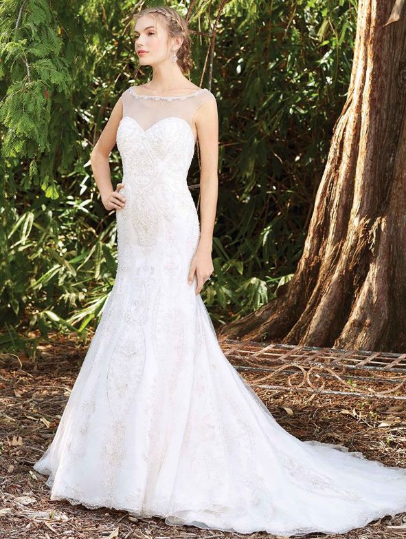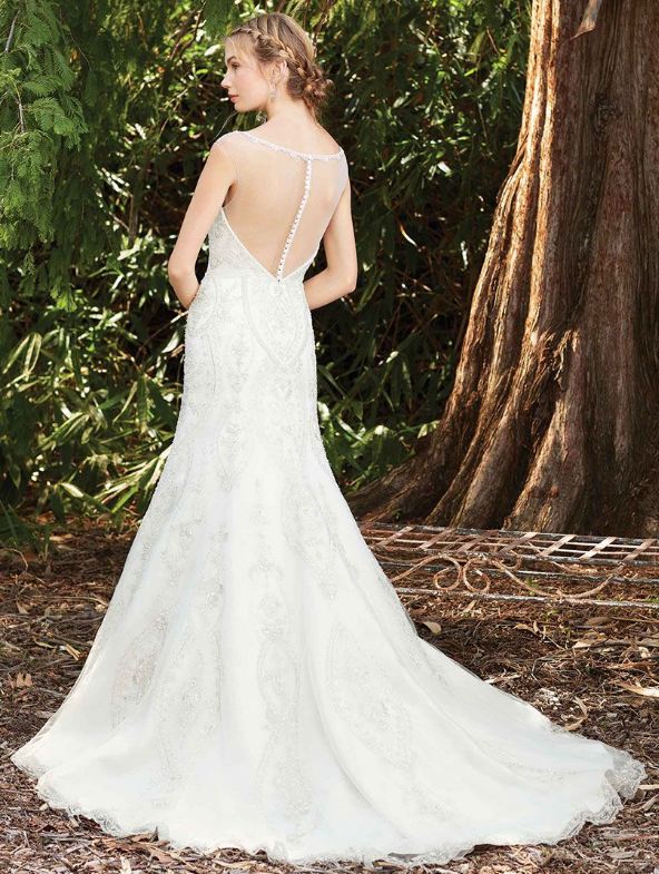 Lavender offers chic, delicate row of beading lines the collarbone of this illusion bateau neckline fit and flare gown, before falling into a heavily beaded bodice with an intricately scalloped lace hemline. The illusion back is decorated by buttons.