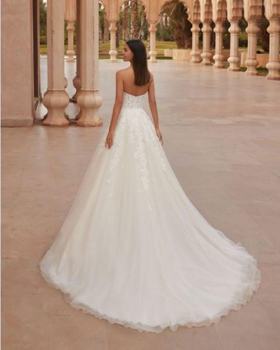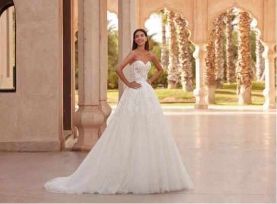 Exquisite opulent lace adorns the bodice and cascades into the luxurious Tulle skirt of this breathtaking strapless, Sweetheart neck Ball gown. Optional lace, statement sleeves add a unique, romantic touch. Shown: Ivory