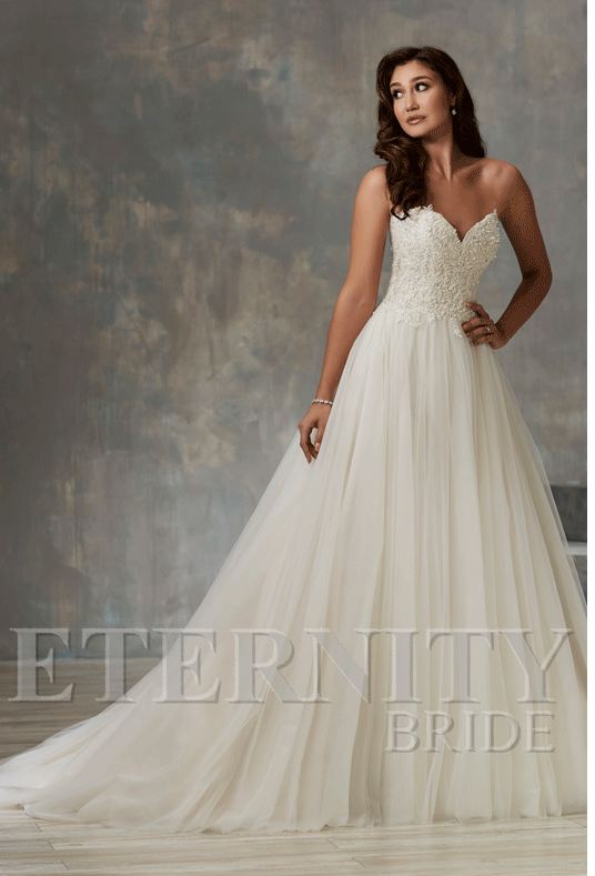 Beaded lace covers this strapless, sweetheart neckline bodice. The back bodice has a sheer detail with exposed boning and functioning buttons. The A-line skirt is made of layers of gathered tulle