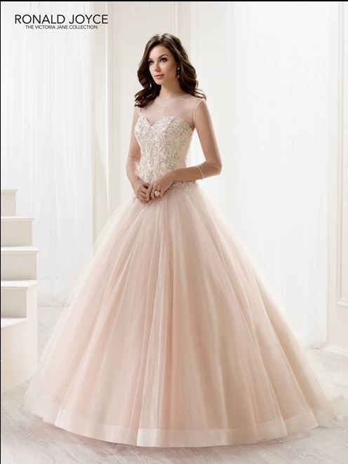 A strapless tulle ball gown with a beaded embroidered bodice and wide hemline. Dress comes with a ¾ length sleeved matching bodysuit. Pictured in Blush/Champagne.